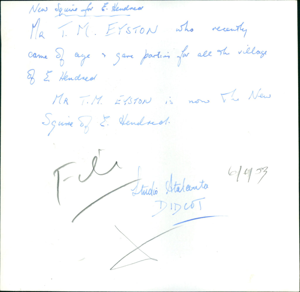 Mr T. M. Eystin who came of age and gave parties for all the village of E. Hendred. Mr T. M. Eyston is now the new Squire of E. Hendred. Mr T. M. Eystin who came of age and gave parties for all the village of E. Hendred. Mr T. M. Eyston is now the new Squire of E. Hendred.