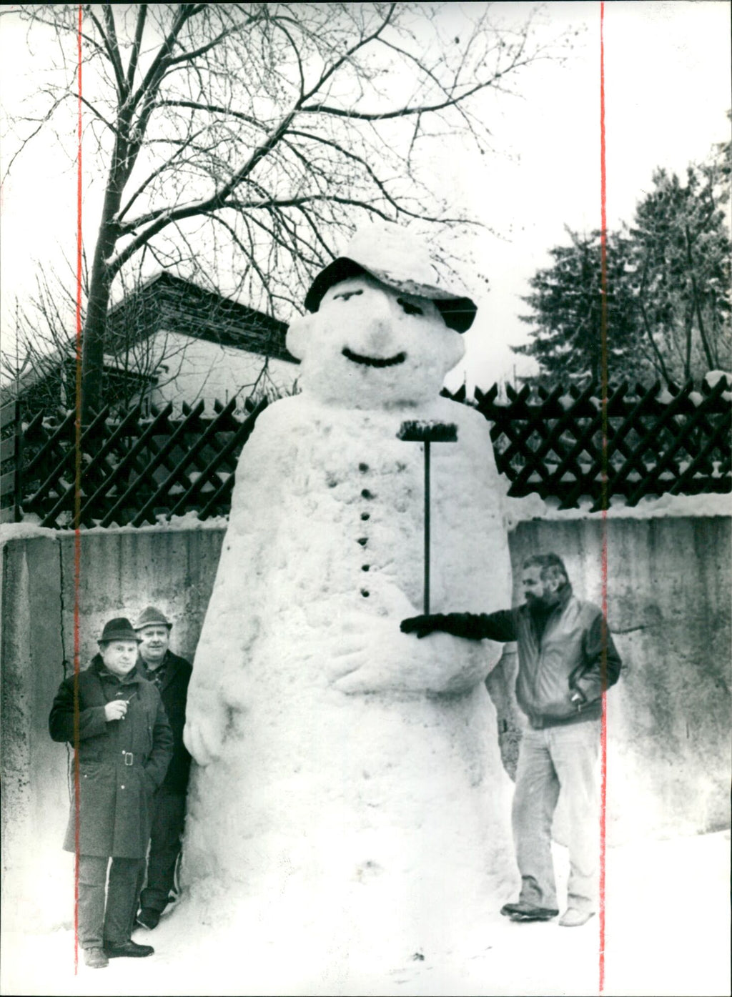 A 5 m high snowman in the Taunus. Das Foto zeigt drei Männer neben einem fünf Meter hohen Schneemann im Taunus.
