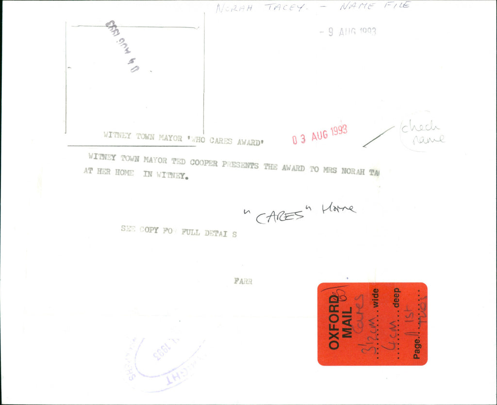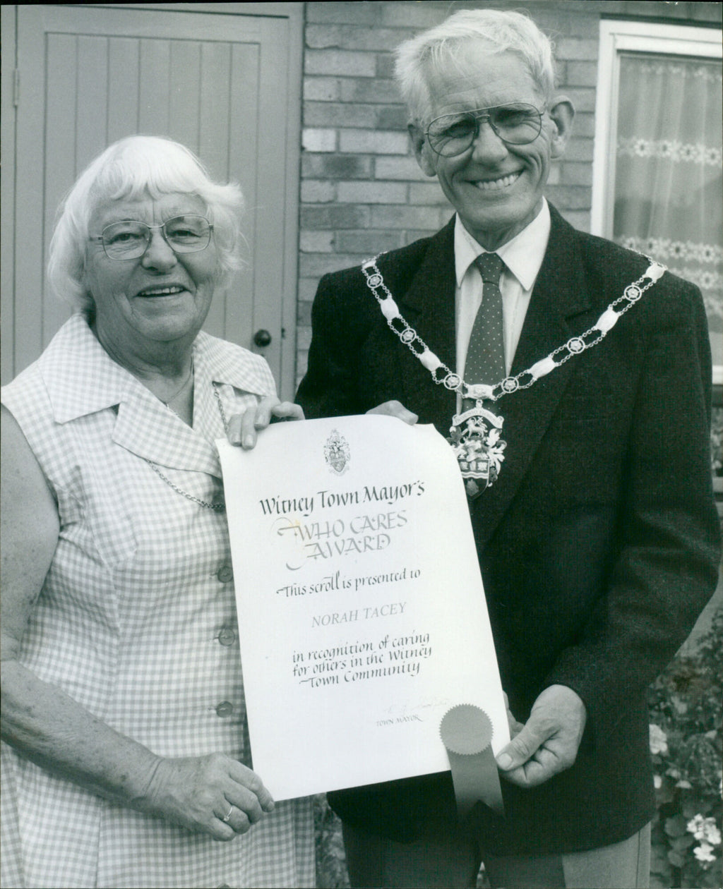 Witney Town Mayor Ted Cooper presents the award to Mrs. Nora at her home in Witney. Witney Town Mayor Ted Cooper presents the award to Mrs. Nora at her home in Witney.