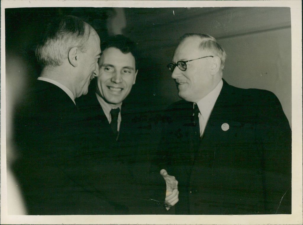 Three man smiling, two are shaking hands Three man smiling, two are shaking hands