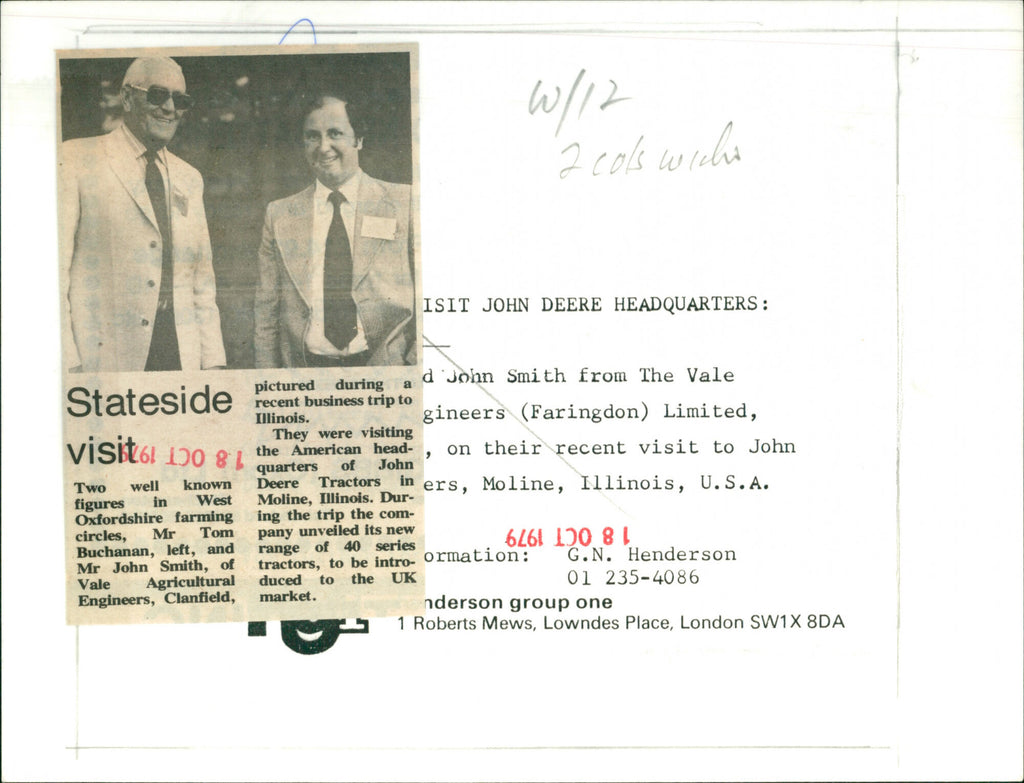 Two well known figures in West Oxfordshire farming circles, Mr. Tom Buchanan and Mr. John Smith, of Vale Agriculture Engineers, during business trip to Illinois. Two well known figures in West Oxfordshire farming circles, Mr. Tom Buchanan and Mr. John Smith, of Vale Agriculture Engineers, during business trip to Illinois.