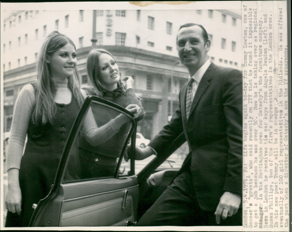 Tommy Lawton, one of the Soccer's "greats", taking over as regional manager in the Nottingham area for Catesby's the furniture company. He receives his car keys from Angela Beuden and Susan Phillips. Tommy Lawton, one of the Soccer's "greats", taking over as regional manager in the Nottingham area for Catesby's the furniture company. He receives his car keys from Angela Beuden and Susan Phillips.