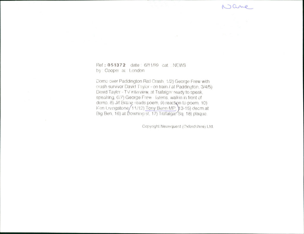 Press photo of Tony Benn MP at the Dome over Paddington Rail Crash Press photo of Tony Benn MP at the Dome over Paddington Rail Crash