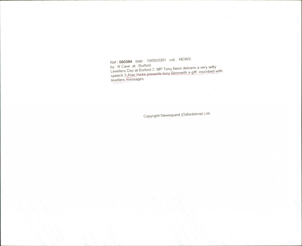 Alan Hicks presents Tony Benn with a gift inscribed with levellers messages at Levellers Day at Burford. Alan Hicks presents Tony Benn with a gift inscribed with levellers messages at Levellers Day at Burford.