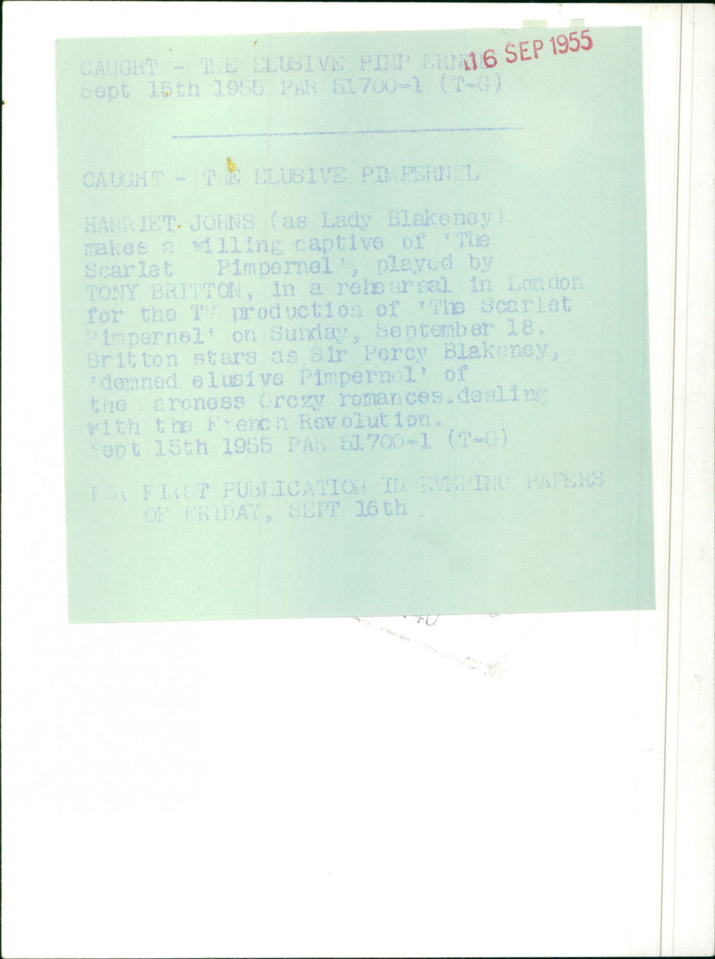 Tony Britton, Harriet Johns in a rehearsal in London for the TV production of "The Scarlet Pimpernel" Tony Britton, Harriet Johns in a rehearsal in London for the TV production of "The Scarlet Pimpernel"