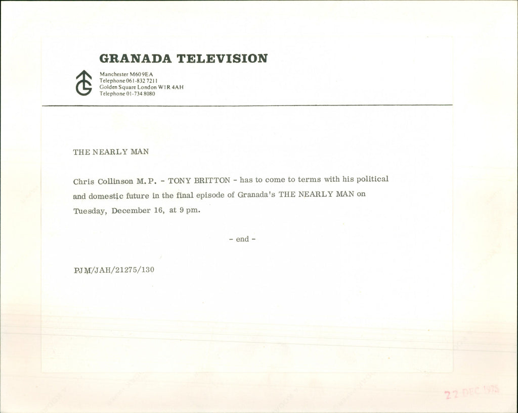 Tony Britton as Chris Collinson MP has come to terms with his political and domestic future in the final episode of Granada's The Nearly Man Tony Britton as Chris Collinson MP has come to terms with his political and domestic future in the final episode of Granada's The Nearly Man