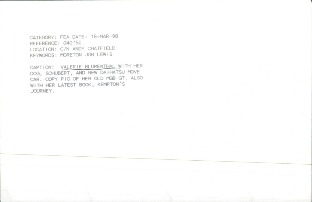 Valerie Blumentahl with her dog, Schubert, and new Daihatsu move car. Valerie Blumentahl with her dog, Schubert, and new Daihatsu move car.