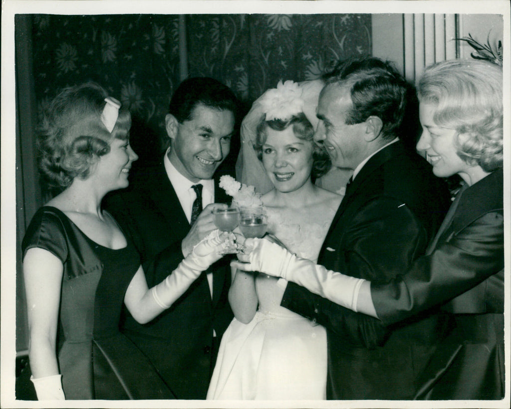 The bride and groom are toasted at the reception by her twin sister Babs, and her sister Joy, with Joy's husband, Billy Wright. The bride and groom are toasted at the reception by her twin sister Babs, and her sister Joy, with Joy's husband, Billy Wright.