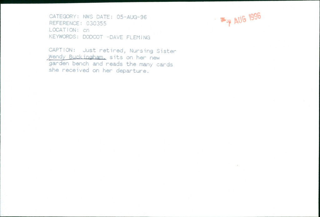 Retired Nursing Sister Wendy Buckingham sits on her garden bench and reads the many cards she received on her departure. Retired Nursing Sister Wendy Buckingham sits on her garden bench and reads the many cards she received on her departure.
