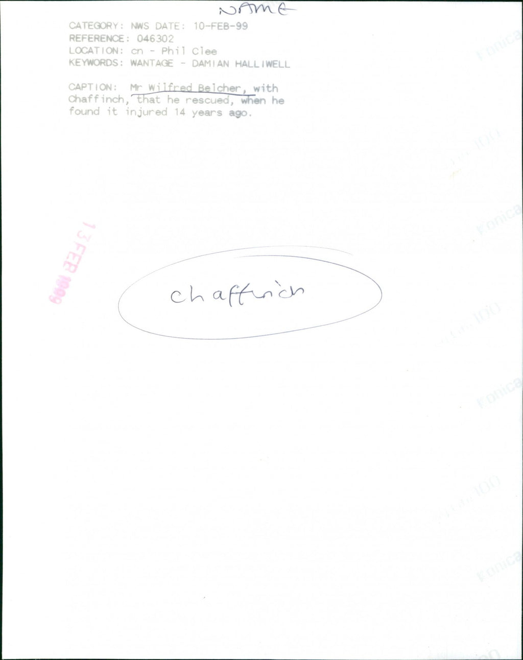 Mr. Wilfred Belcher, with Chaffinch, that he rescued, when he found it injured 14 years ago. Mr. Wilfred Belcher, with Chaffinch, that he rescued, when he found it injured 14 years ago.