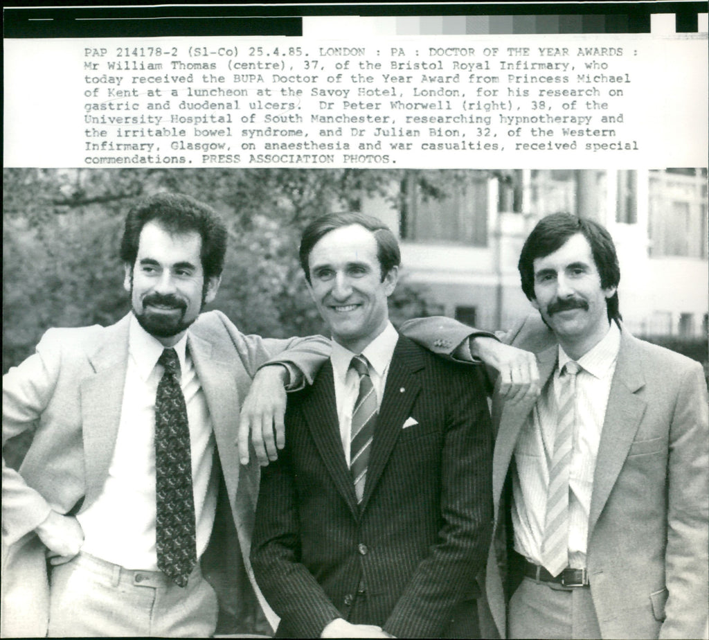 William Thomas (center), of the Bristol Royal Infirmary, received the BUPA Doctor of the Year Award from Princess Michael of Kent at a luncheon at the Savoy Hotel, for his research on gastric and duodenal ulcers. Dr. Peter Whorwell (right) and Dr. Julian Bion, received special commendations. William Thomas (center), of the Bristol Royal Infirmary, received the BUPA Doctor of the Year Award from Princess Michael of Kent at a luncheon at the Savoy Hotel, for his research on gastric and duodenal ulcers. Dr. Peter Whorwell (right) and Dr. Julian Bion, received special commendations.
