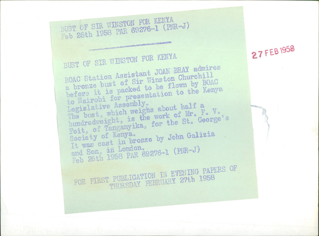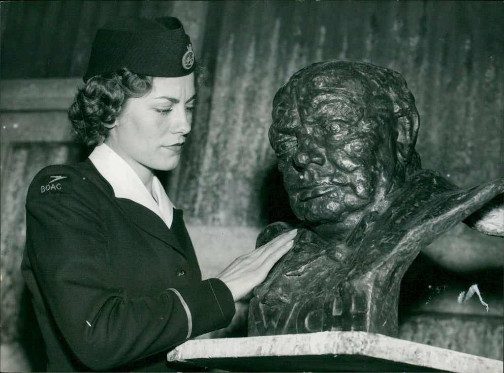 BOAC Station Assistant Joan Bray admires a bronze bust of Sir Winston Churchill. BOAC Station Assistant Joan Bray admires a bronze bust of Sir Winston Churchill.