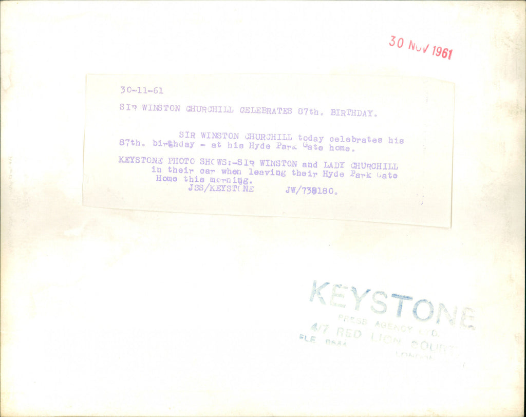 Sir Winston Churchill and Lady Churchill in their car when leaving their Hyde Park Gate Home. Sir Winston Churchill and Lady Churchill in their car when leaving their Hyde Park Gate Home.