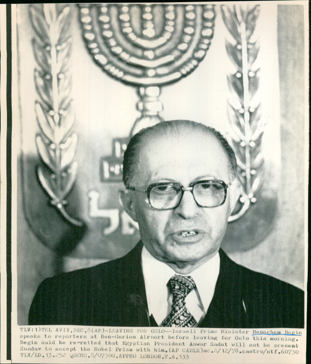 Menachem Begin spoke to reporters at Ben-Guiron Airport. Menachem Begin spoke to reporters at Ben-Guiron Airport.