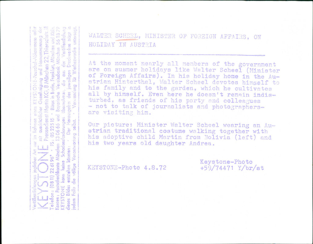 WALTER SCHEEL, MINISTER OF POREIGN APPAIRS, OW HOLIDAY IN AUSTRIA At the moment nearly 311 members of the government are on summer holidays like Walter Scheel (Minister of Foreign Affairs).