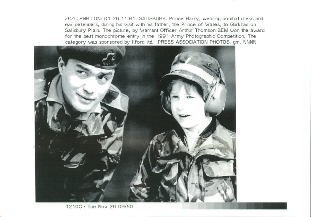Prince Harry, wearing combat dress and ear defenders, during his visit with his father, the Prince of Wales, to Gurkhas on Salisbury Plain. Prince Harry, wearing combat dress and ear defenders, during his visit with his father, the Prince of Wales, to Gurkhas on Salisbury Plain.