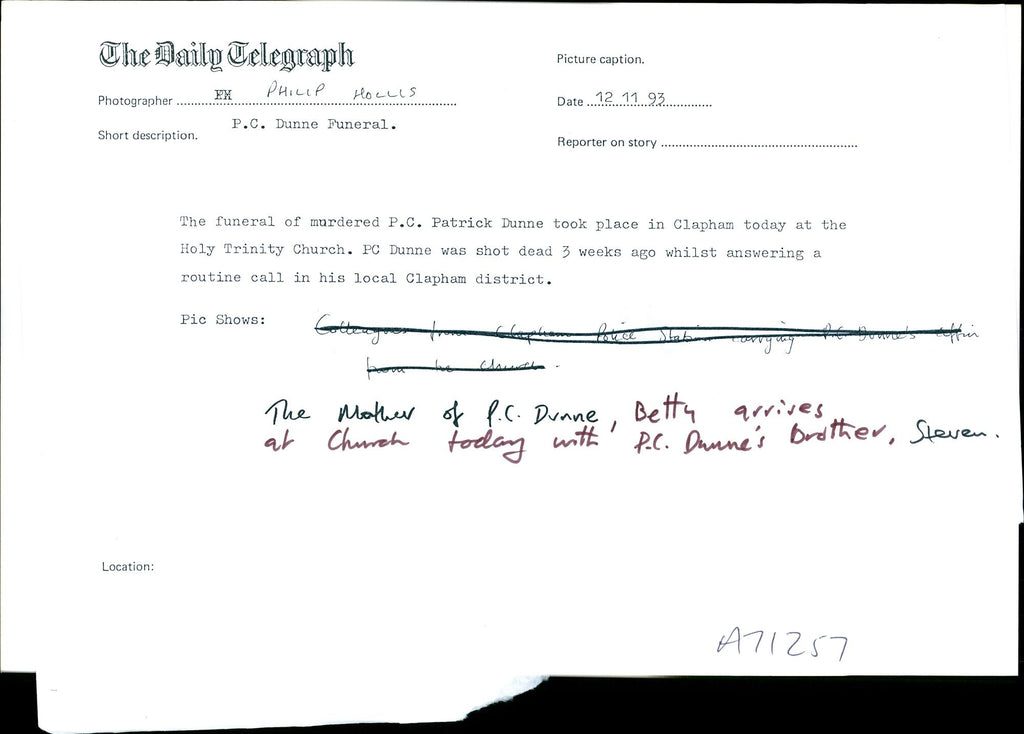 Funeral of murdered P.C. Patrick Dunne took place in Clapham today at the Holy Trinity Church. PC Dunne was shot dead 3 weeks ago whilst answering a routine call in his local Clapsham district. The funeral was attended by his mother, Betty, and brother Steven. Funeral of murdered P.C. Patrick Dunne took place in Clapham today at the Holy Trinity Church. PC Dunne was shot dead 3 weeks ago whilst answering a routine call in his local Clapsham district. The funeral was attended by his mother, Betty, and brother Steven.