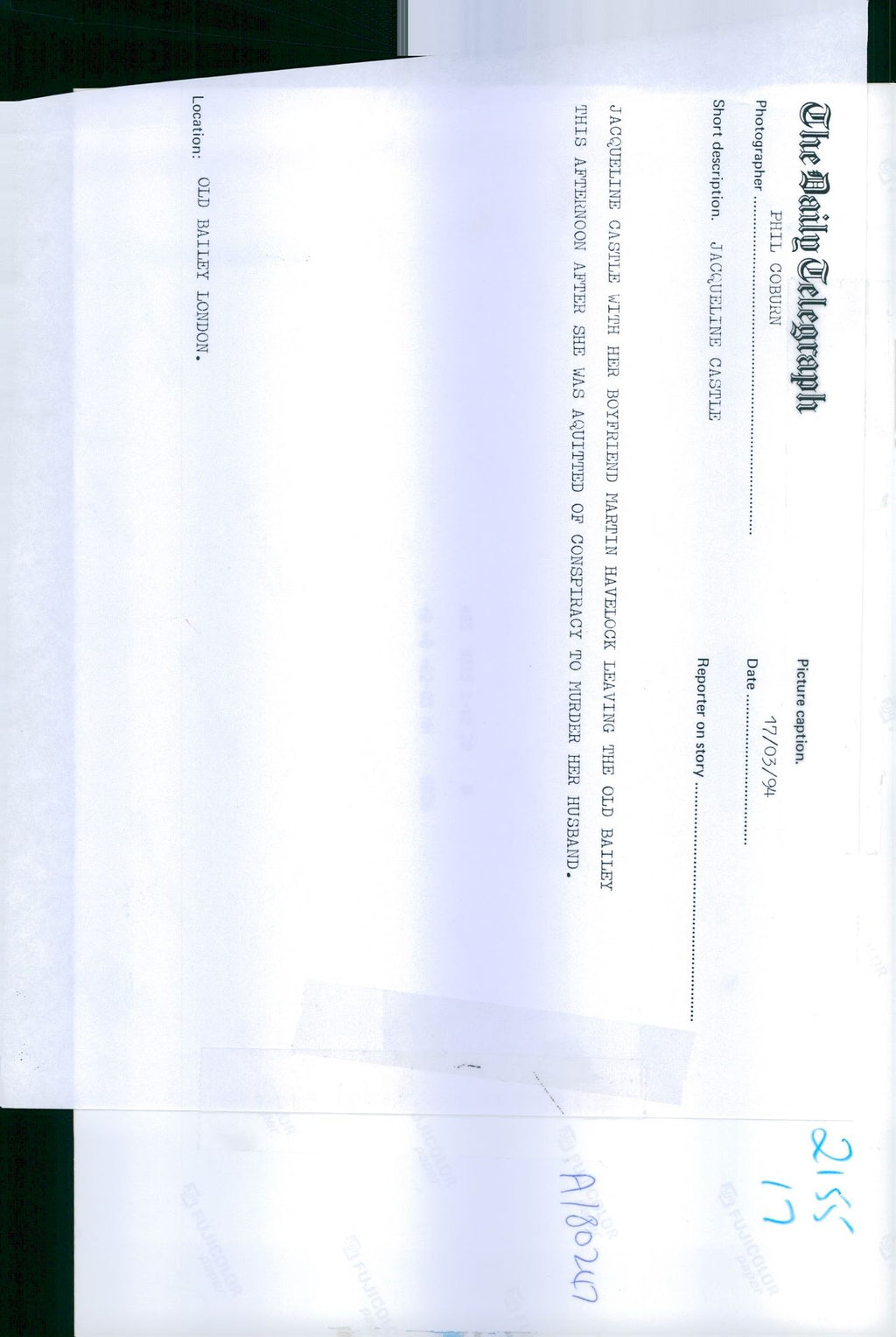 JACQUELINE CASTLE was convicted of conspiracy to murder her husband. She and her boyfriend were seen leaving the Old BAILEY in London. The Daily Telegraph published the story on 17 March, 1994. The story was written by Philip Burn and was photographed by Jacqueline Castle. JACQUELINE CASTLE was convicted of conspiracy to murder her husband. She and her boyfriend were seen leaving the Old BAILEY in London. The Daily Telegraph published the story on 17 March, 1994. The story was written by Philip Burn and was photographed by Jacqueline Castle.