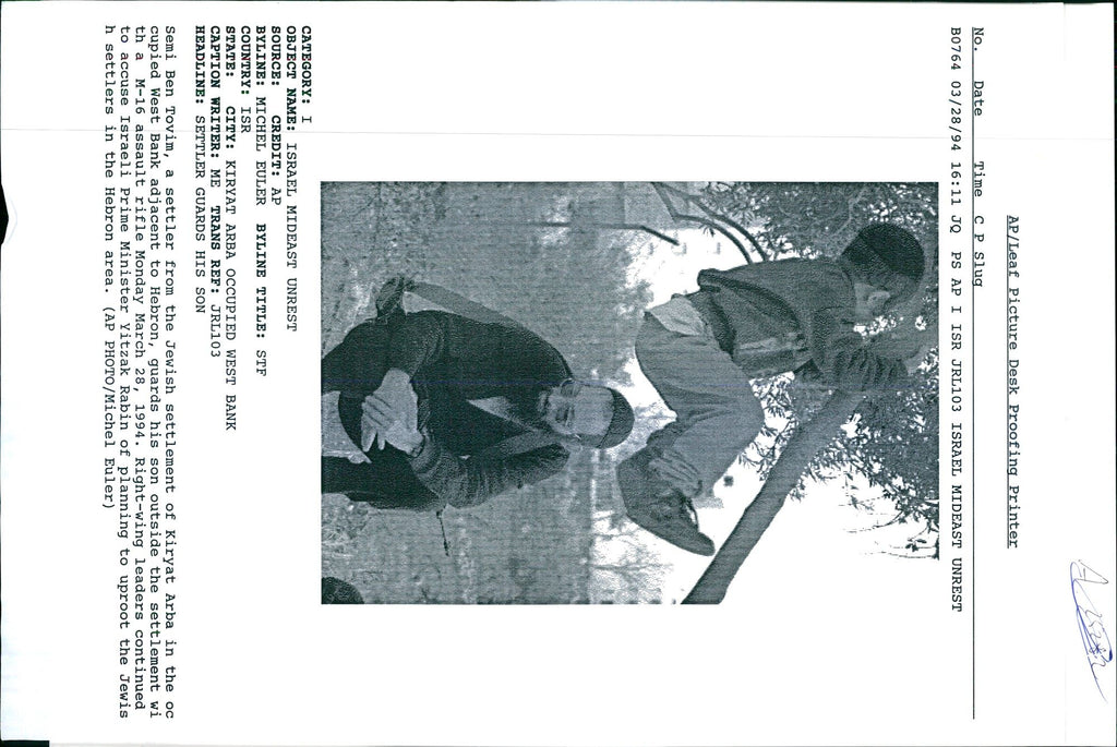 Right - wing leaders continued to accuse Israeli Prime Minister Yitzak Rabin of planning to uproot the Jewis h settlers in the Hebron area. ( AP PHOTO / Michel Euler ) A settler from the Jewish settlement of Kiryat Arba in the oc cupied West Bank adjacent to Hebron. Right - wing leaders continued to accuse Israeli Prime Minister Yitzak Rabin of planning to uproot the Jewis h settlers in the Hebron area. ( AP PHOTO / Michel Euler ) A settler from the Jewish settlement of Kiryat Arba in the oc cupied West Bank adjacent to Hebron.