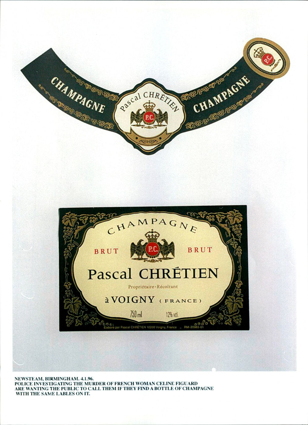 Police are investigating the murder of French woman CELINE FIGUARD. They are asking the public to call them if they find a bottle of CHAMPAGNE with the samelables on it. The bottle is 750ml and the label is written by Pascal CHRÉTIEN BRUT. Police are investigating the murder of French woman CELINE FIGUARD. They are asking the public to call them if they find a bottle of CHAMPAGNE with the samelables on it. The bottle is 750ml and the label is written by Pascal CHRÉTIEN BRUT.