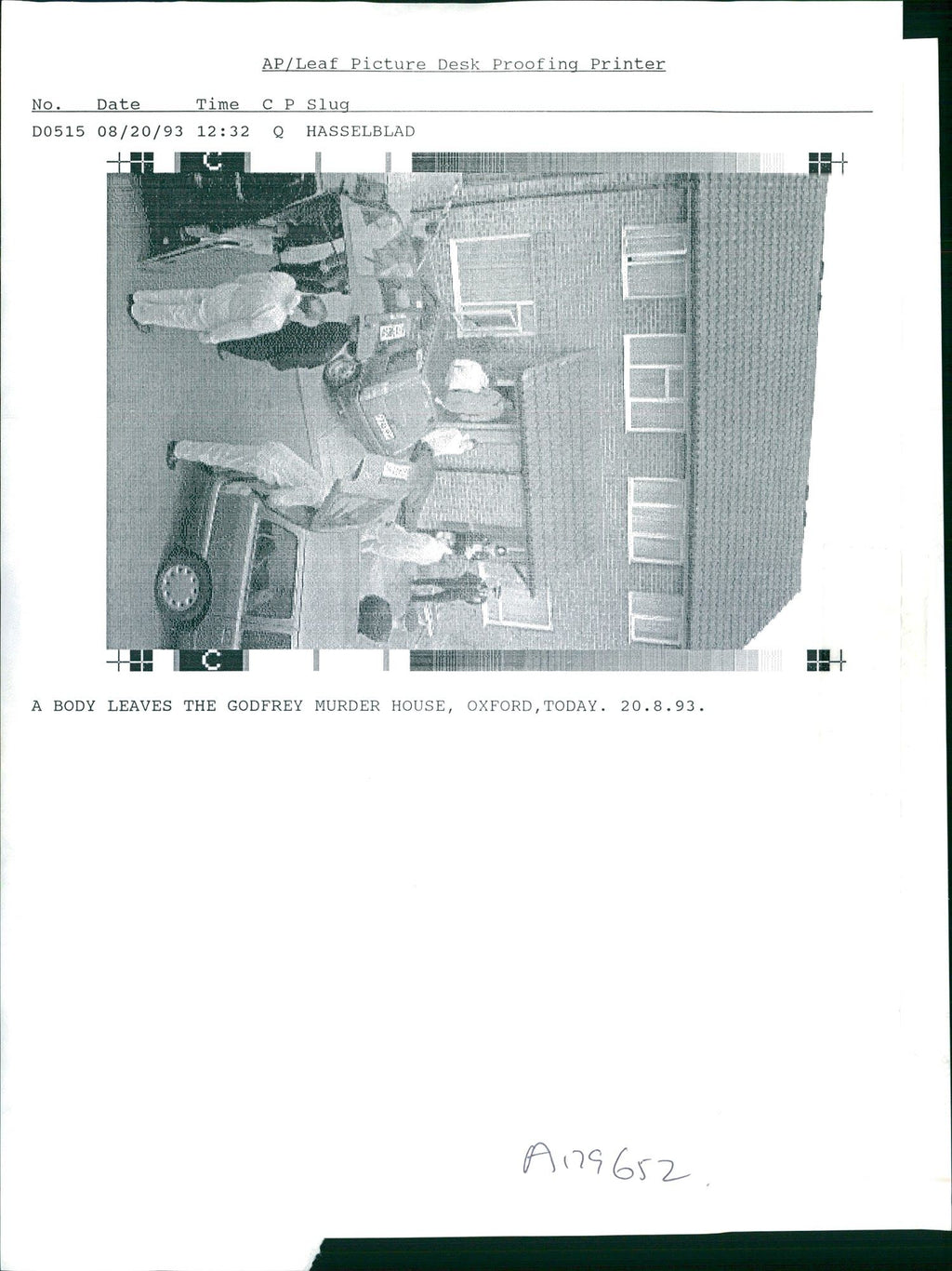 A body leaves the Godfrey Murder House. - Vintage Photograph