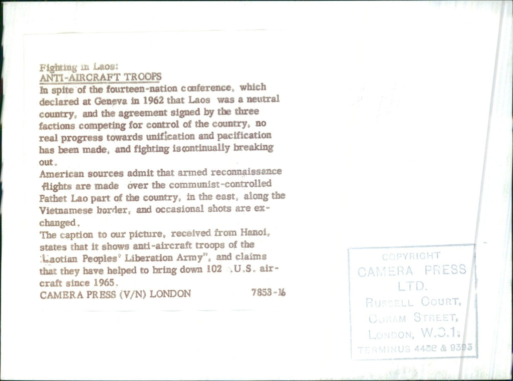 Anti-aircraft troops of the Laotian Peoples' Liberation Army are seen in Laos, where fighting continues despite the 1962 Geneva Agreement. - Vintage Photograph