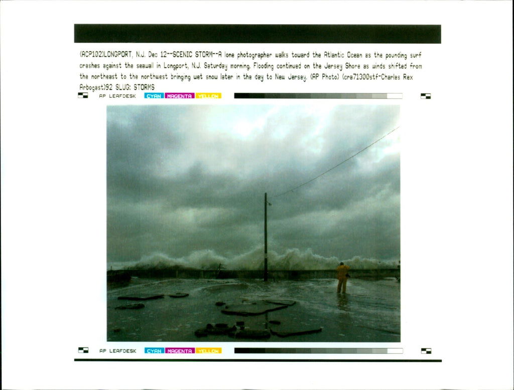 Flooding continued on the Jersey Shore as winds shifted from the northeast to the northwest bringing wet snow later in the day to New Jersey. ( ACP102 ) Longport , NJ . Dec 12 -- SCENIC STORM -- Alone photographer walks toward the Atlantic Ocean as the pounding surf crashes against the seawall in Longport. Flooding continued on the Jersey Shore as winds shifted from the northeast to the northwest bringing wet snow later in the day to New Jersey. ( ACP102 ) Longport , NJ . Dec 12 -- SCENIC STORM -- Alone photographer walks toward the Atlantic Ocean as the pounding surf crashes against the seawall in Longport.