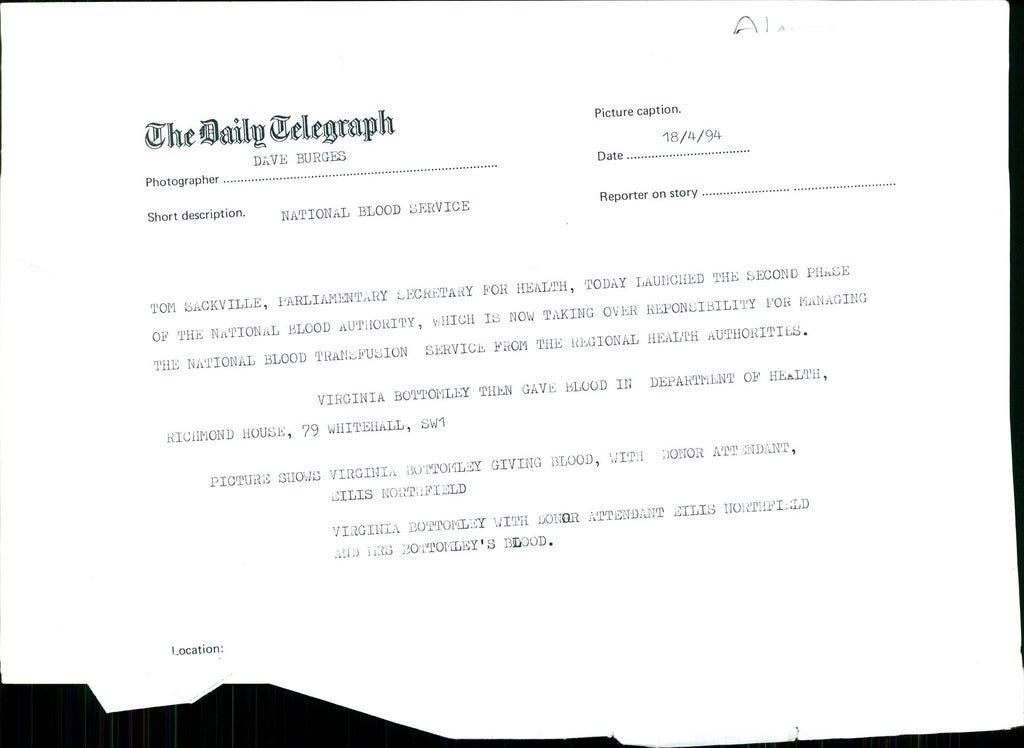 Health Secretary Virginia Bottomley donates blood - Vintage Photograph