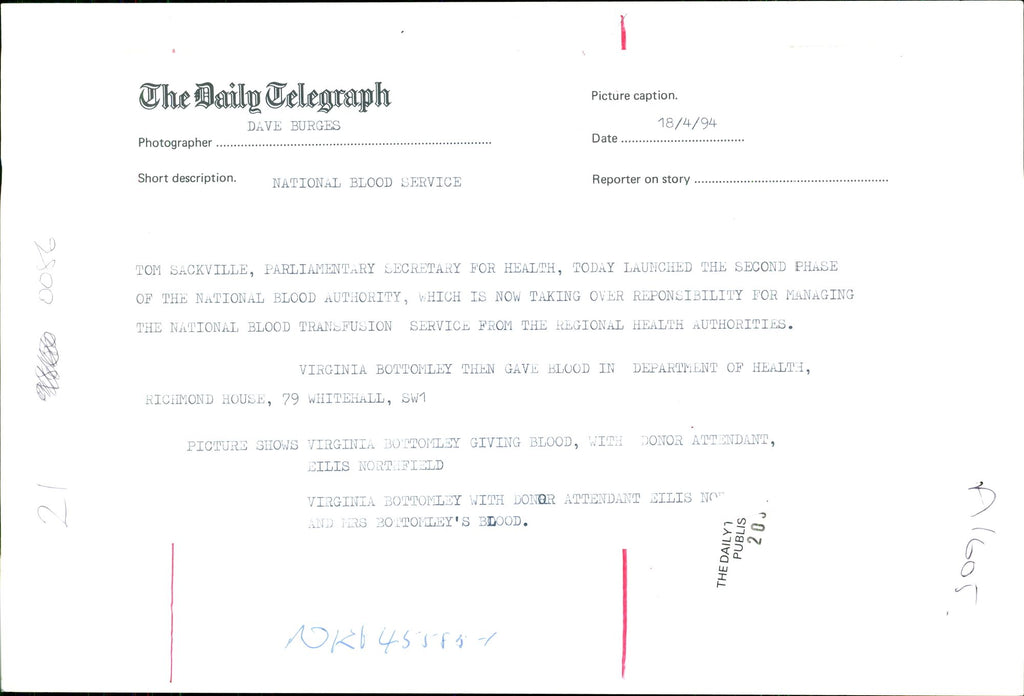 Health secretary Virginia Bottomley donates blood - Vintage Photograph