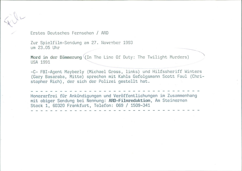 FBI Agent Mayberly (Michael Gross) and Deputy Winters (Gary Basraba) talk to Kahl's henchman Scott Faul (Christopher Rich), who has turned himself in to police. ====== FBI-agent Mayberly (Michael Gross) en hulpsheriff Winters (Gary Basraba) praten met Kahl's handlanger Scott Faul (Christopher Rich), die zichzelf bij de politie heeft aangegeven. FBI Agent Mayberly (Michael Gross) and Deputy Winters (Gary Basraba) talk to Kahl's henchman Scott Faul (Christopher Rich), who has turned himself in to police. ====== FBI-agent Mayberly (Michael Gross) en hulpsheriff Winters (Gary Basraba) praten met Kahl's handlanger Scott Faul (Christopher Rich), die zichzelf bij de politie heeft aangegeven.