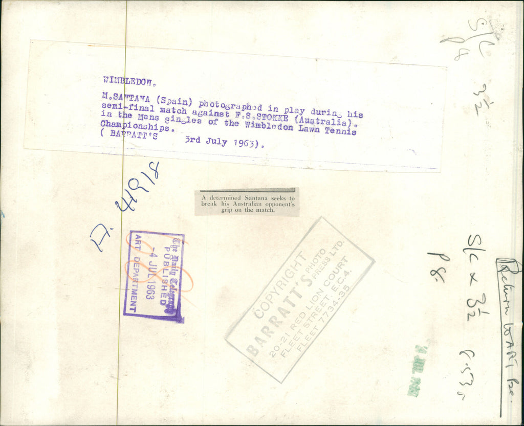 Manuel Martínez Santana, in play during his semi final match against FS Stokke (Australia) in the men's singles of the Wimbledon Lawn Tennis Championship. Manuel Martínez Santana, in play during his semi final match against FS Stokke (Australia) in the men's singles of the Wimbledon Lawn Tennis Championship.