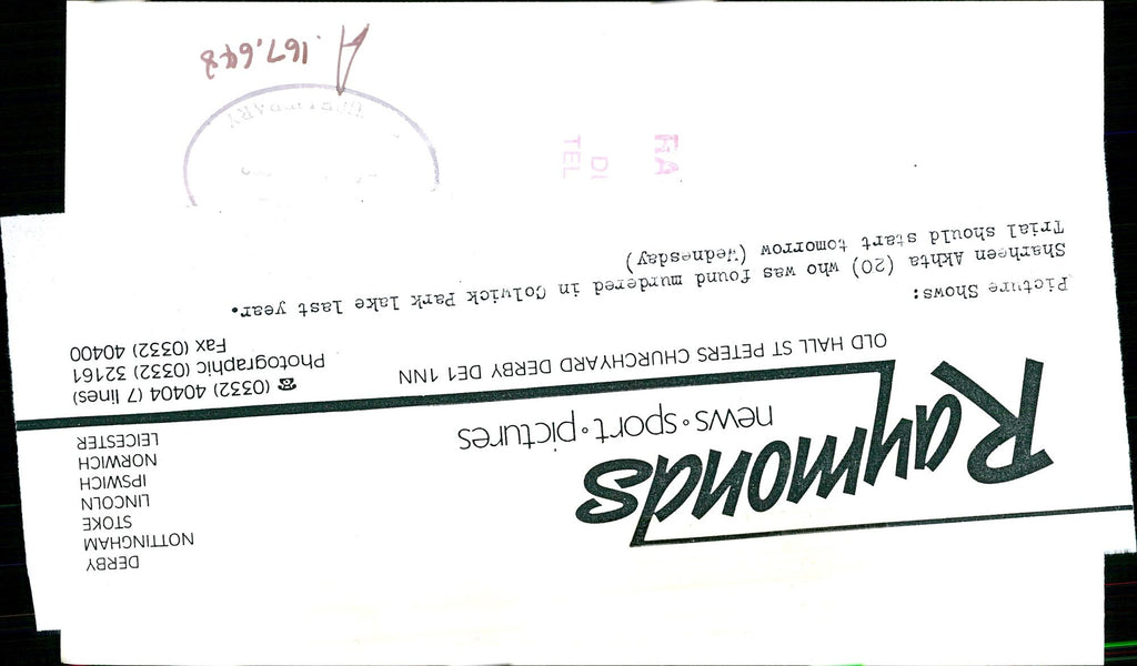 Sharhren Akhta ( 20) who was found murdered in Coluick Park lake last year. Trial should start tomorrow ( Wednesday ) 167,678. Raymonds DERBY NOTTINGHAM STOKE LINCOLN IPSWICH NORWICH LEICESTER newSºsport.pictures OLD HALL ST PETERS CHURCHYARD DERby DE1 1NN & ( 0332 ) 40404 ( 7 lines ) Photographic ( 0 332 ) 32161 Picture Shows : Fax ( 0331 ) 40400 Fax. Sharhren Akhta ( 20) who was found murdered in Coluick Park lake last year. Trial should start tomorrow ( Wednesday ) 167,678. Raymonds DERBY NOTTINGHAM STOKE LINCOLN IPSWICH NORWICH LEICESTER newSºsport.pictures OLD HALL ST PETERS CHURCHYARD DERby DE1 1NN & ( 0332 ) 40404 ( 7 lines ) Photographic ( 0 332 ) 32161 Picture Shows : Fax ( 0331 ) 40400 Fax.