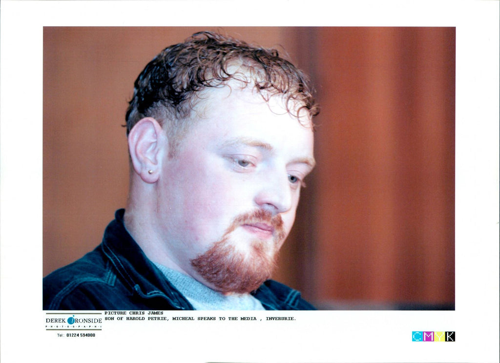 Son of murdered Harold Petrie, Micheal speaks to the media - Vintage Photograph