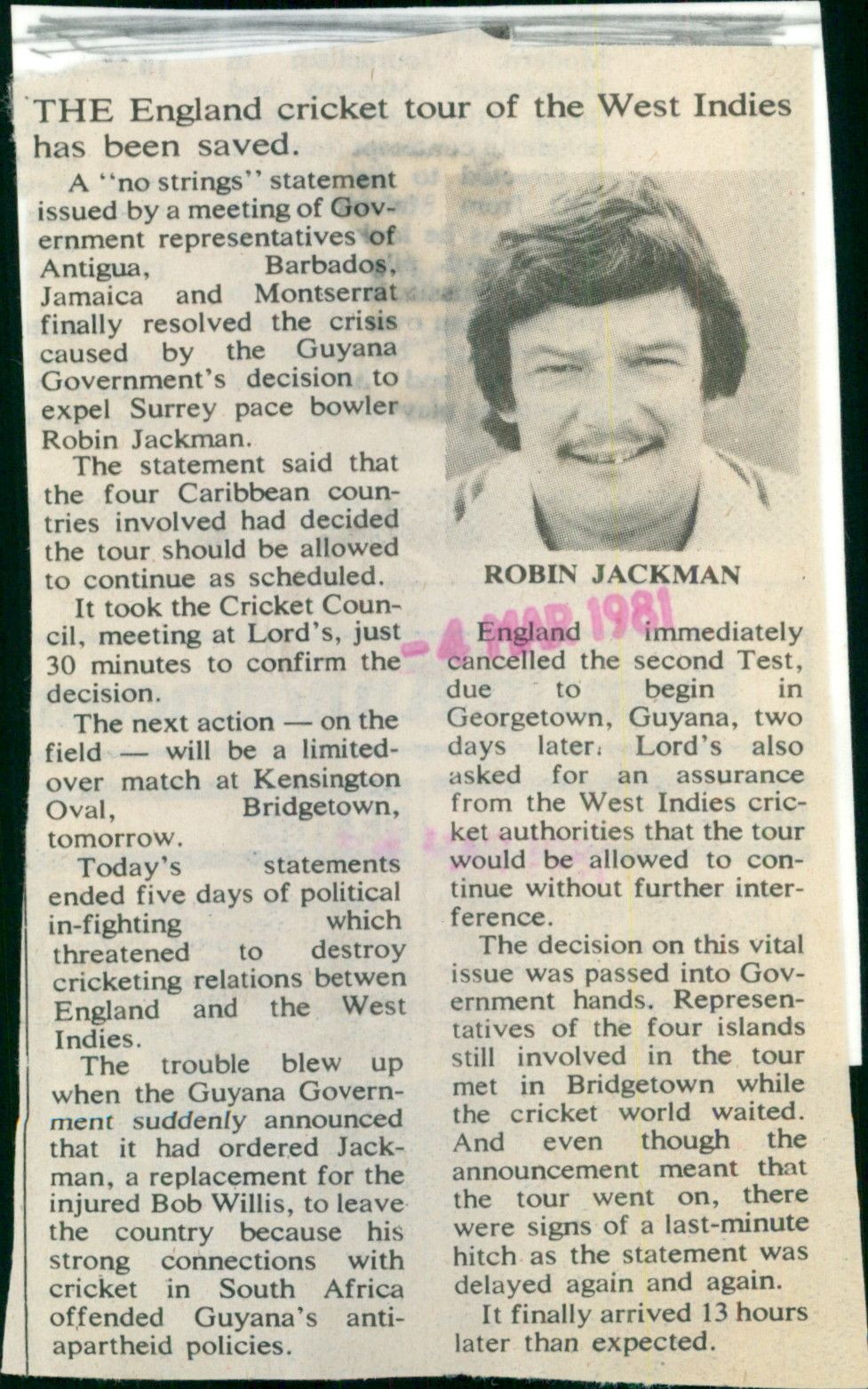After five days of political in-fighting which threatened to destroy cricketing relations between England and the West Indies, representatives of the Caribbean countries met in Bridgetown and issued a "no strings" statement that allowed the tour to go on. The announcement came 13 hours later than expected, bringing an end to the crisis caused by the Guyana Government's decision to expel Surrey pace bowler Robin Jackman. After five days of political in-fighting which threatened to destroy cricketing relations between England and the West Indies, representatives of the Caribbean countries met in Bridgetown and issued a "no strings" statement that allowed the tour to go on. The announcement came 13 hours later than expected, bringing an end to the crisis caused by the Guyana Government's decision to expel Surrey pace bowler Robin Jackman.
