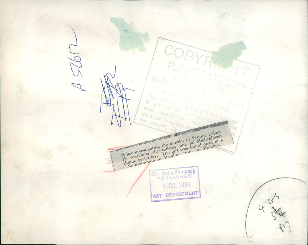 Police investigating the murder of Yvonne Laker, 15, searching the railway line at Micheldever, Hants. The girl was found dead in a Southampton to Reading train. Police investigating the murder of Yvonne Laker, 15, searching the railway line at Micheldever, Hants. The girl was found dead in a Southampton to Reading train.