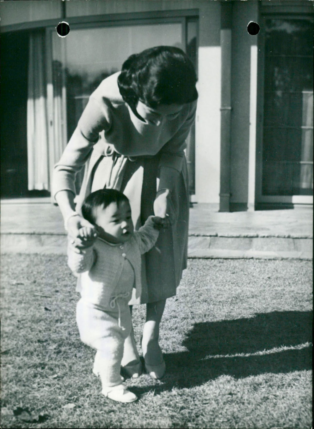 Princess Michiko is teaching Prince Hiro to walk - Vintage Photograph