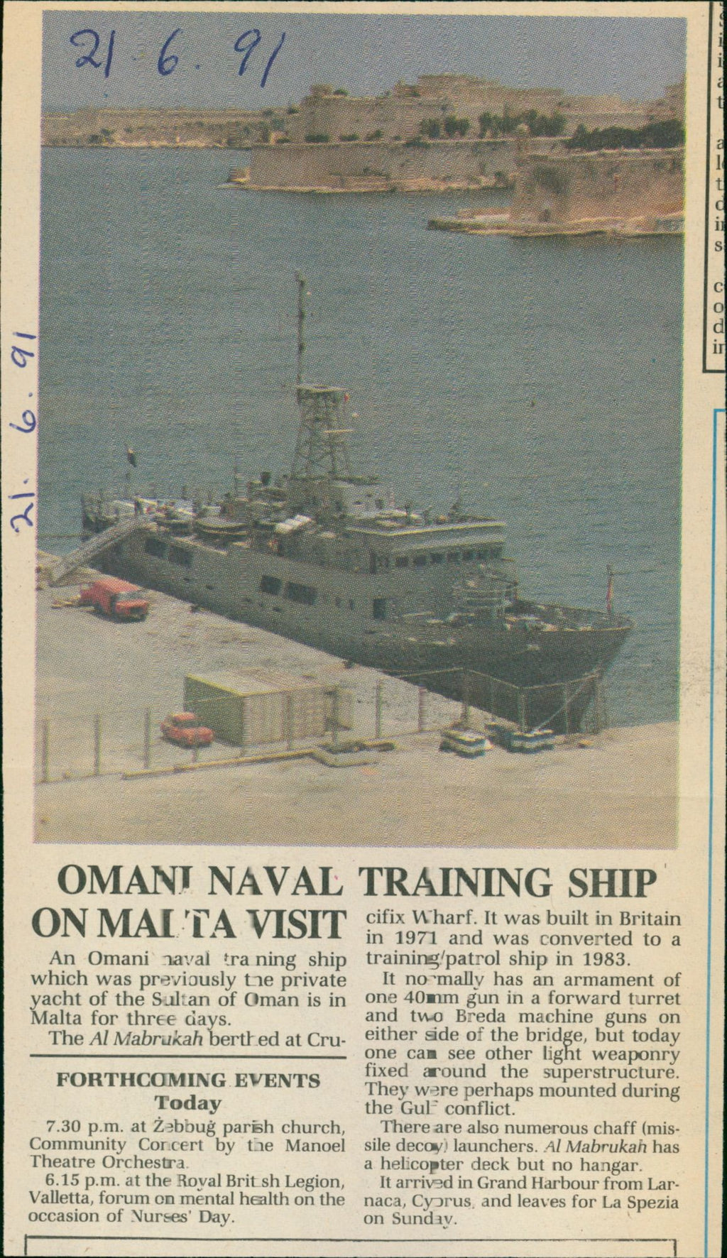 An Omani naval training ship which was previously the private yacht of the Sultan of Oman is in Malta for three days. The Al Mabrukah berthed at Crucifix Wharf. It was built in Britain in 1971 and was converted to a training patrol ship in 1983. It normally has an armament of one 40mm gun in a forward turret and two Breda machine guns in on either side of the bridge, but today one can see other light weaponry fixed around the superstructure. They were perhaps mounted during the Gulf conflict. An Omani naval training ship which was previously the private yacht of the Sultan of Oman is in Malta for three days. The Al Mabrukah berthed at Crucifix Wharf. It was built in Britain in 1971 and was converted to a training patrol ship in 1983. It normally has an armament of one 40mm gun in a forward turret and two Breda machine guns in on either side of the bridge, but today one can see other light weaponry fixed around the superstructure. They were perhaps mounted during the Gulf conflict.