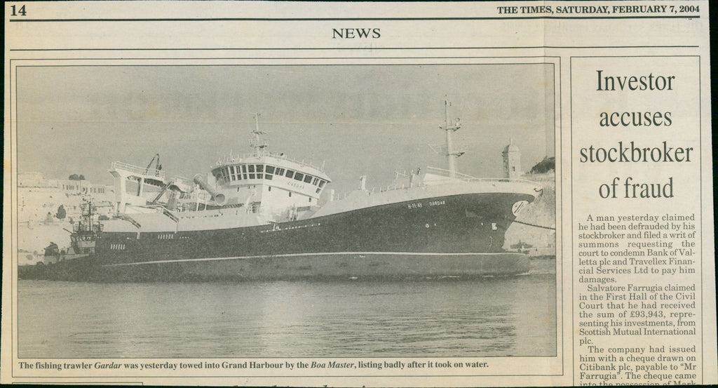 The fishing trawler Gardar was towed into Grand Harbour by the Boa Master, listing badly after it took on water. The fishing trawler Gardar was towed into Grand Harbour by the Boa Master, listing badly after it took on water.