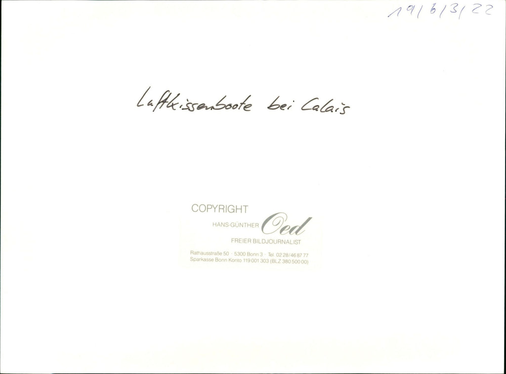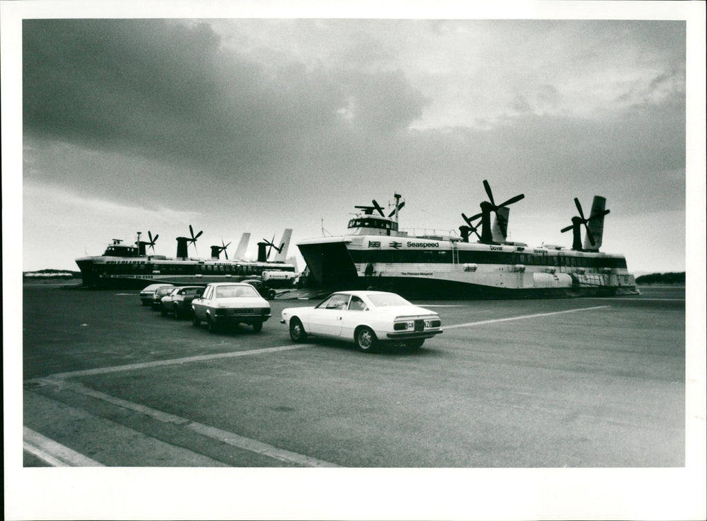 The picture shows two hovercraft near Calais. In the foreground is a Seaspeed hovercraft. Das Foto zeigt die Luftkissenboote der Reedereien Hoverlloyd (im Hintergrund) und Seaspeed (vorne), die die Ärmelkanalroute zwischen England und Frankreich befahren.