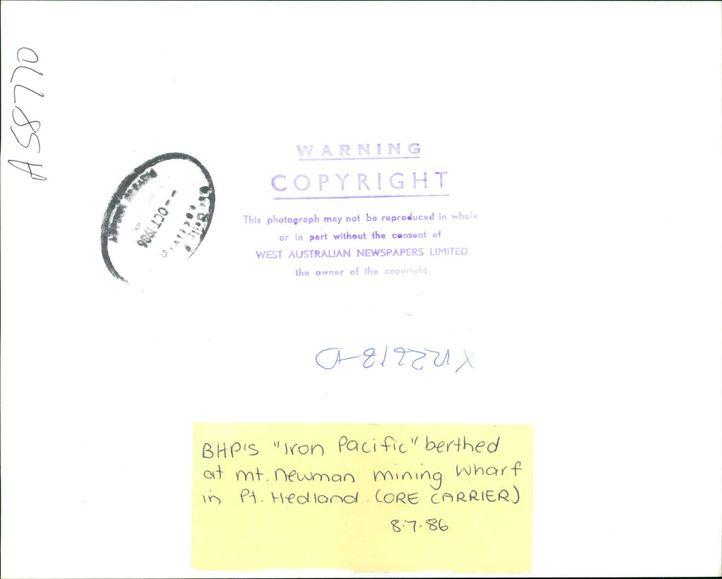 Ships: Iron Pacific berthed at Mt. Newman mining wharf in Pt Hedland core carrier. Ships: Iron Pacific berthed at Mt. Newman mining wharf in Pt Hedland core carrier.