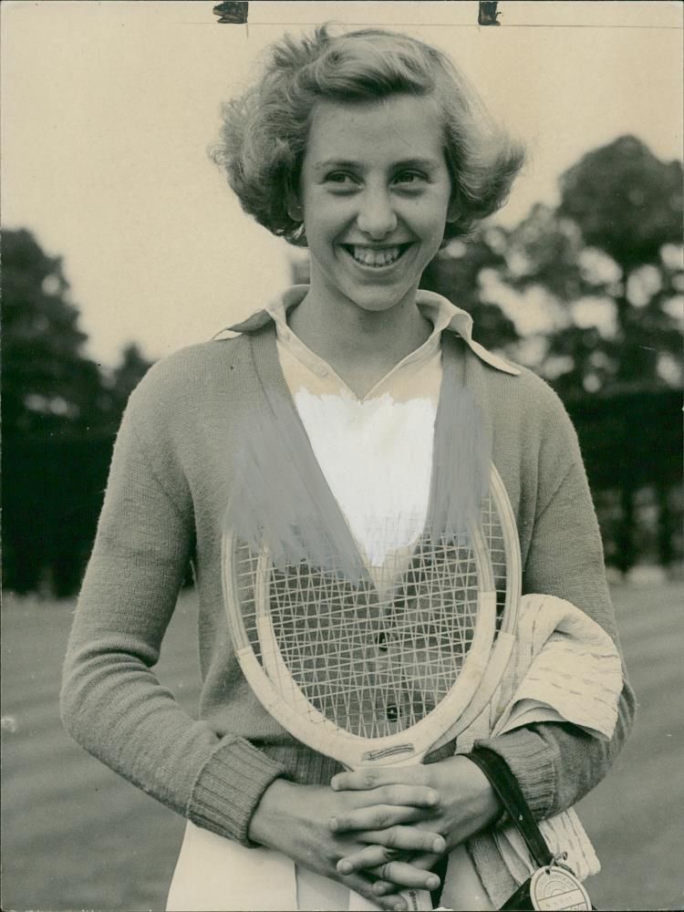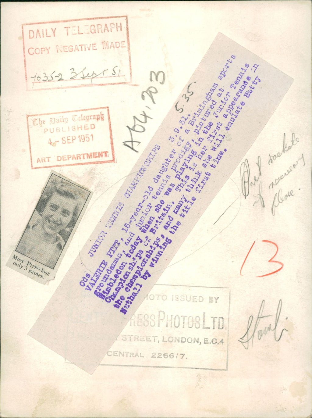 Valerie Pitt, promising young tennis players, during her first appearance in the Junior Tennis Championship of Britain. Valerie Pitt, promising young tennis players, during her first appearance in the Junior Tennis Championship of Britain.