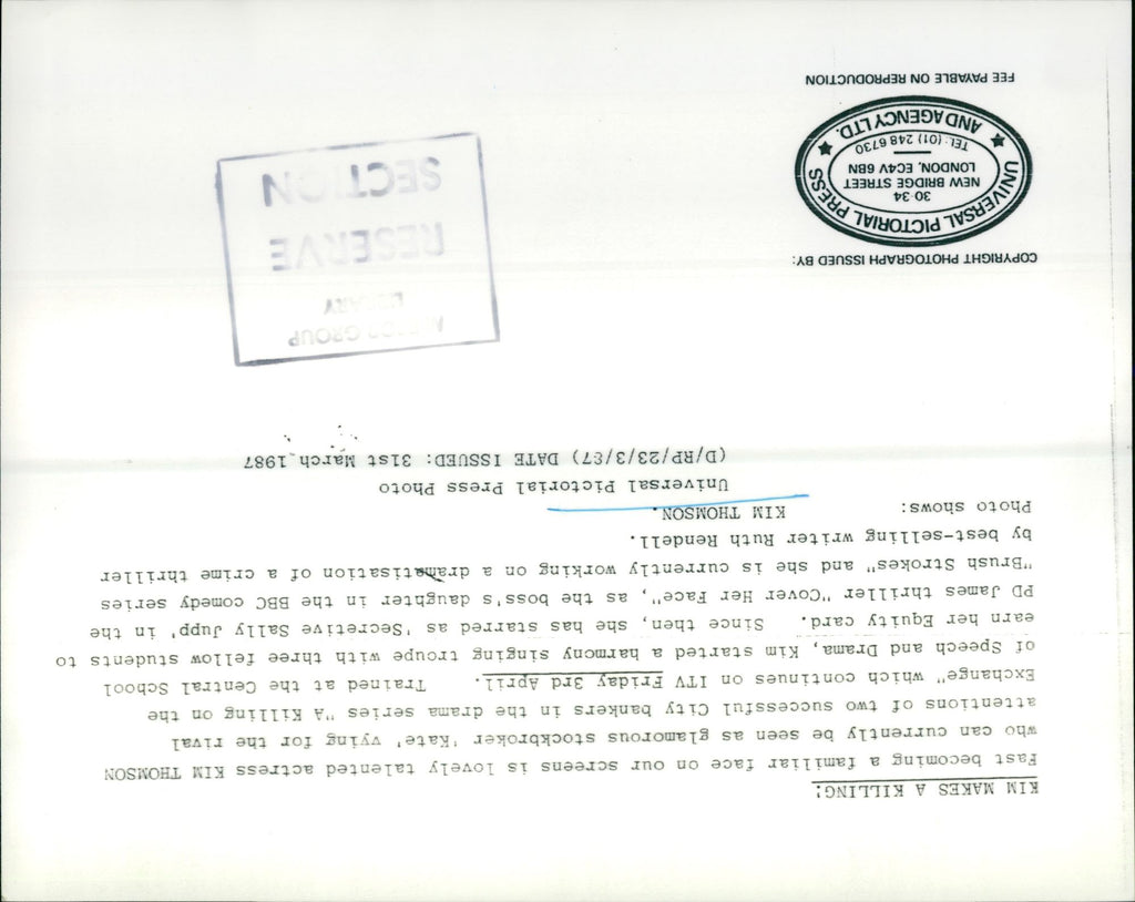 1987 - THOMSON KIM ACTRESS MAKES KILLING KATE, LONDON, WRITER 1987 - THOMSON KIM ACTRESS MAKES KILLING KATE, LONDON, WRITER