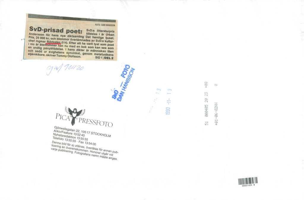 1990 SVDS AWADED LIGHT SMALLNESS AFTE UBAN HAVING JANSSON LEIF POET SWEDEN 1990 SVDS AWADED LIGHT SMALLNESS AFTE UBAN HAVING JANSSON LEIF POET SWEDEN