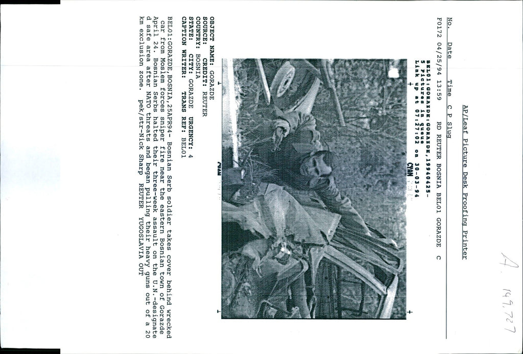 Bosnian Serbs halted their three - week assault on the U.N. - designate d safe area after NATO threats and began pulling their heavy guns out of a 20 km exclusion zone. Bosnian Serb soldier takes cover behind wrecked car from Moslem forces sniper fire near the eastern Bosnian town of Gorazde. Bosnian Serbs halted their three - week assault on the U.N. - designate d safe area after NATO threats and began pulling their heavy guns out of a 20 km exclusion zone. Bosnian Serb soldier takes cover behind wrecked car from Moslem forces sniper fire near the eastern Bosnian town of Gorazde.