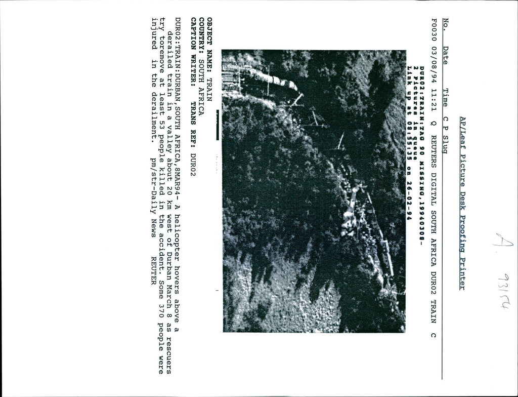 At least 53 people were killed in the accident. Some 370 people were injured in the derailment. A helicopter hovers above a derailed train in a valley about 20 km west of Durban March 8 as rescuers try to remove at least 53 dead. The accident happened about 20km from Durban in South Africa. At least 53 people were killed in the accident. Some 370 people were injured in the derailment. A helicopter hovers above a derailed train in a valley about 20 km west of Durban March 8 as rescuers try to remove at least 53 dead. The accident happened about 20km from Durban in South Africa.