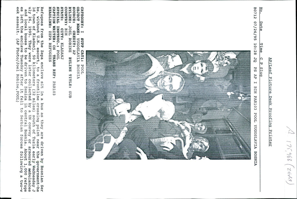 About 1,000 refuge es left the Zepa enclave Tuesday after it fell to Serbian forces following a two - w eek assault. They were later collected by a UN convoy or armoured ambulances and local buses to be driven to Zenica in central Bosnia. ( AP Photo / Joel Robine , POOL ) About 1,000 refuge es left the Zepa enclave Tuesday after it fell to Serbian forces following a two - w eek assault. They were later collected by a UN convoy or armoured ambulances and local buses to be driven to Zenica in central Bosnia. ( AP Photo / Joel Robine , POOL )
