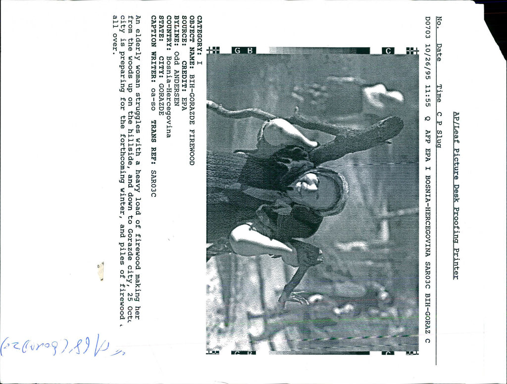 An elderly woman struggles with a heavy load of firewood making her from the woods up on the hillside , and down to Gorazde city. The city is preparing for the forthcoming winter , and piles of fire wood all over . 168 ( Soun ) 2 ) An elderly woman struggles with a heavy load of firewood making her from the woods up on the hillside , and down to Gorazde city. The city is preparing for the forthcoming winter , and piles of fire wood all over . 168 ( Soun ) 2 )