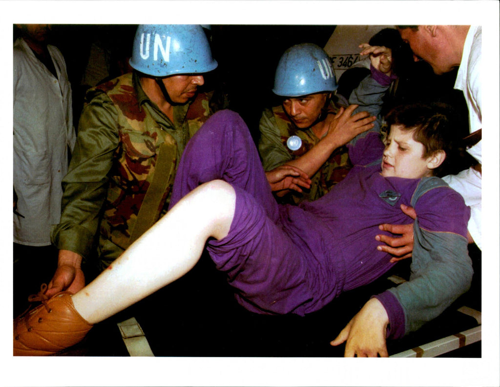 Mirsad Mujkic lost his right leg during the lat est shelling of the enclave by Bosnian Serbs. Mirsad was one of the 34 wounded civili ans who were allowed to leave the enclave. 117 old people and children have been allowed to left the enclave after being overrun. Mirsad Mujkic lost his right leg during the lat est shelling of the enclave by Bosnian Serbs. Mirsad was one of the 34 wounded civili ans who were allowed to leave the enclave. 117 old people and children have been allowed to left the enclave after being overrun.