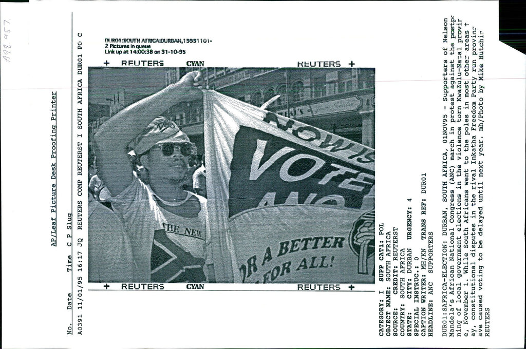 Voting to be delayed until next year due to constitutional disputes in the rival Inkatha Freedom Party run provins ave caused delays. South Africans went to the poles in most othe areas t ay, but constitutional disputes have caused voting to be delays. DURO1 : SOUTH AFRICA : DURBAN , 19951101 2 Pictures in queue Link up at 14:00:38 on 31-10-95 Voting to be delayed until next year due to constitutional disputes in the rival Inkatha Freedom Party run provins ave caused delays. South Africans went to the poles in most othe areas t ay, but constitutional disputes have caused voting to be delays. DURO1 : SOUTH AFRICA : DURBAN , 19951101 2 Pictures in queue Link up at 14:00:38 on 31-10-95