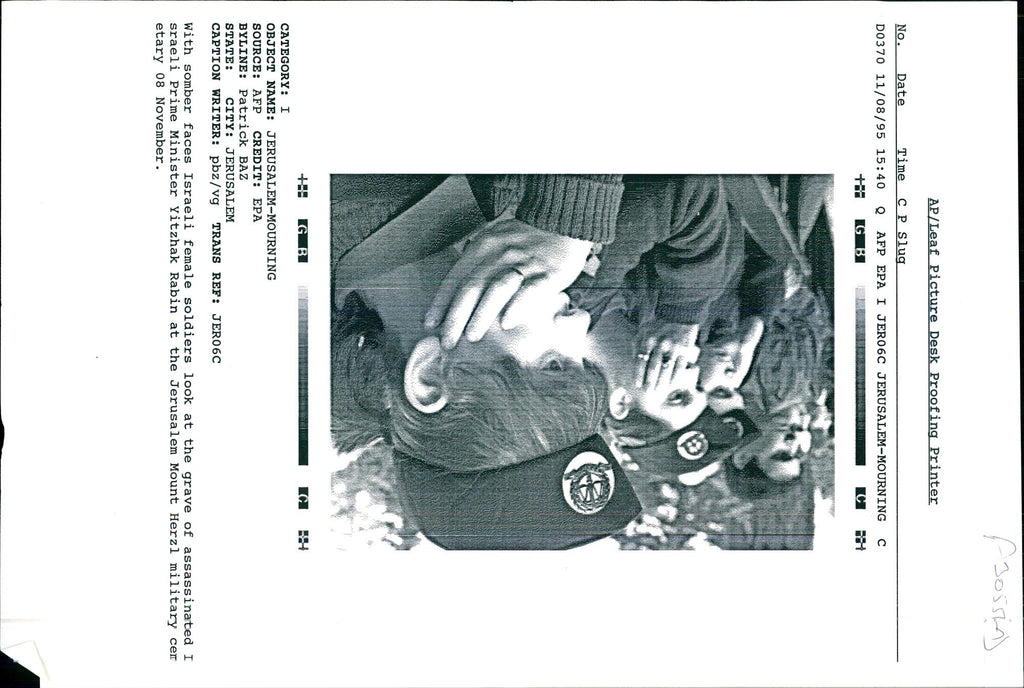 With somber faces Israeli female soldiers look at the grave of assassinated I sraeli Prime Minister Yitzhak Rabin at the Jerusalem Mount Herzl military cem etary 08 November. I JERO6C JERUSALEM - MOURNING GB C ? 141 18 GB CATEGORY : I OBJECT NAME : JERusalem - MourNING SOURCE : AFP CREDIT : EPA BYLINE : Patrick BAZ STATE : CITY : JerusalEM CAPTION WRITER : pbz / vg TRANS REF : JERO 6C With somber faces Israeli female soldiers look at the grave of assassinated I sraeli Prime Minister Yitzhak Rabin at the Jerusalem Mount Herzl military cem etary 08 November. I JERO6C JERUSALEM - MOURNING GB C ? 141 18 GB CATEGORY : I OBJECT NAME : JERusalem - MourNING SOURCE : AFP CREDIT : EPA BYLINE : Patrick BAZ STATE : CITY : JerusalEM CAPTION WRITER : pbz / vg TRANS REF : JERO 6C